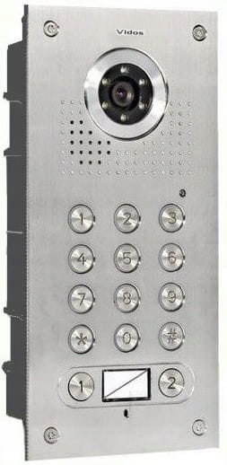Kamera kolorowa dwurodzinna marki Vidos .Wandaloodporna stacja bramowa z płytą czołową wykonaną ze stali nierdzewnej z wbudowanym SZYFRATOREM. Sterowanie elektrozaczepem. Regulowany kąt obiektywu kamery w pionie i poziomie. Podświetlany przycisk wywołania, montaż podtynkowy. Kamera z oświetleniem LED umożliwiająca widzenie w nocy.
