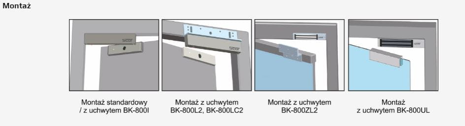 Dodatkowe uchwyty montażowe typu „L”, „ZL”, „UL” pozwalają na montaż zwory praktycznie na każdych drzwiach.